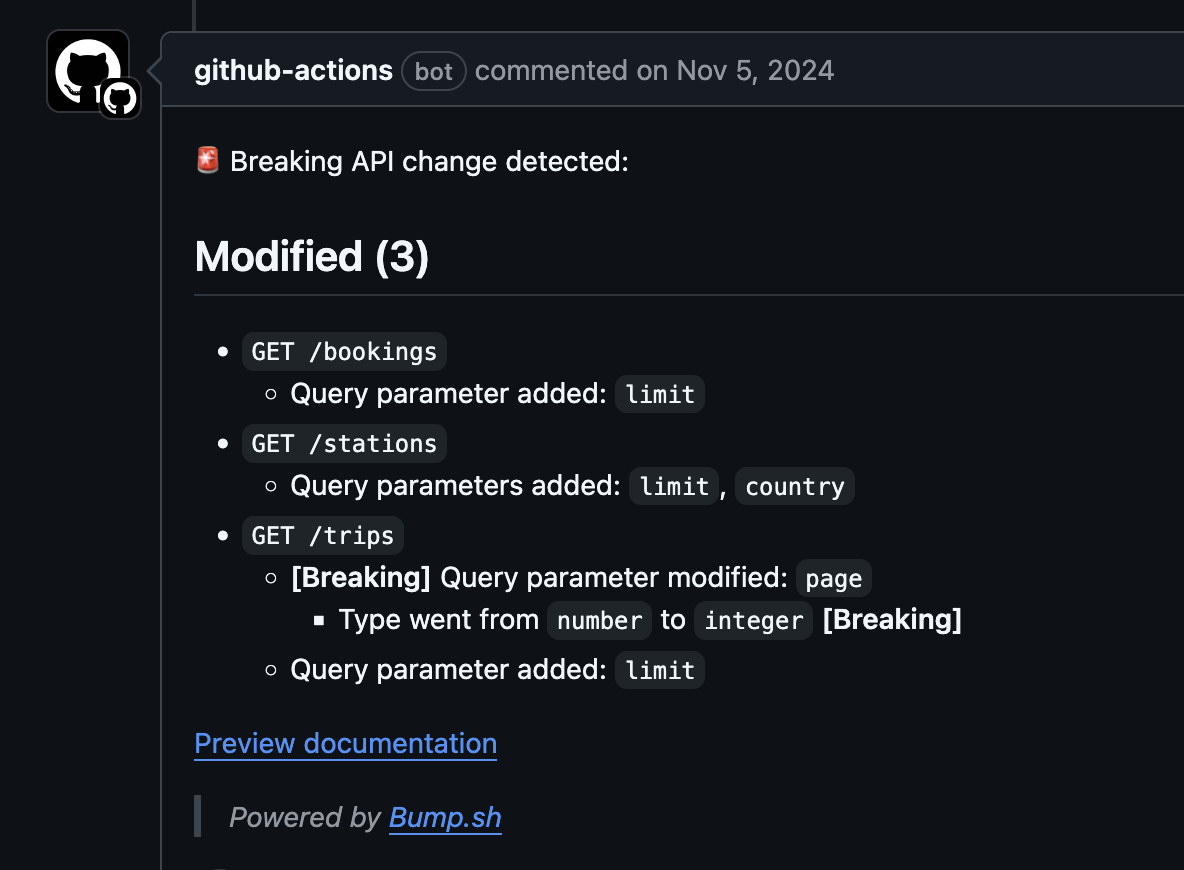 Whenever a pull request is made, or changes are pushed to that pull request, Bump.sh will automatically scan the changes being made to the OpenAPI/AsyncAPI documents. Any consequential changes will be highlighted in the summary of changes.