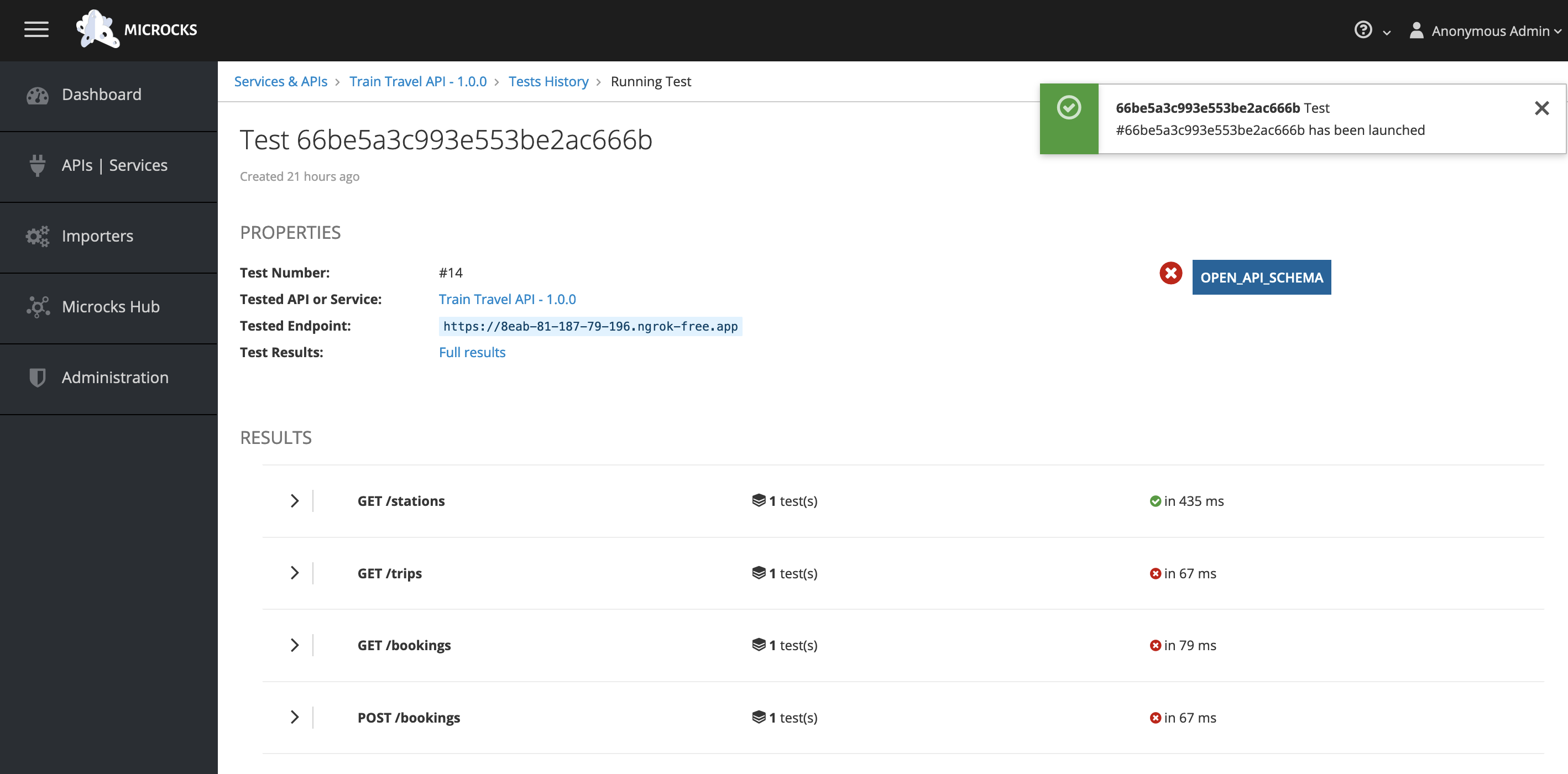 Pick that last one, and hit “Launch test”. Microcks will now send a test request to every operation in your OpenAPI document, based on the data available in OpenAPI and any examples defined for parameters and request bodies.