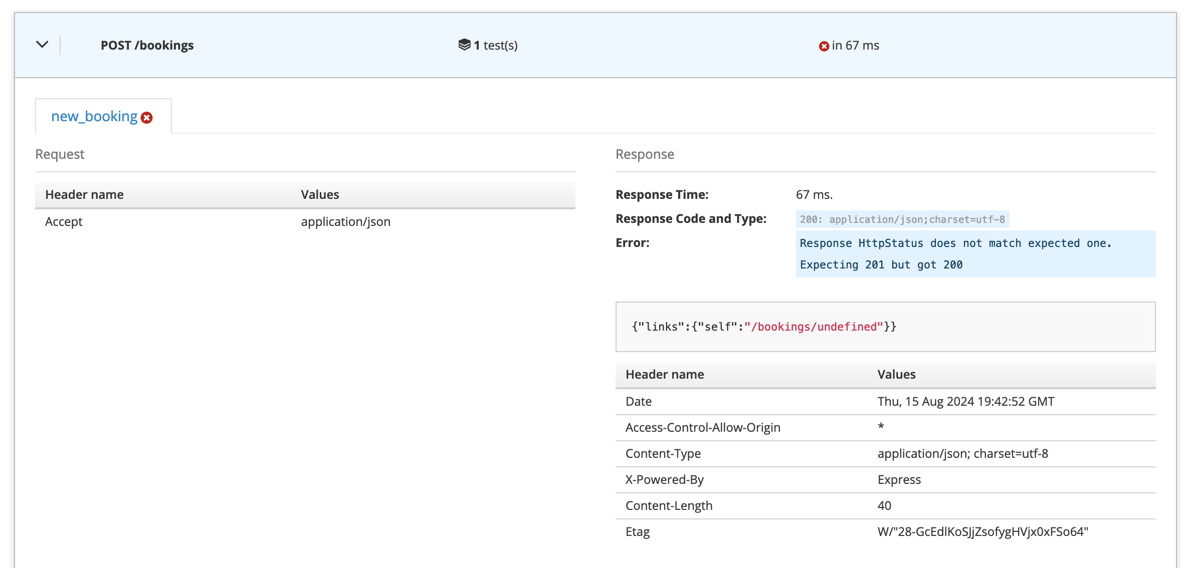 Here the contract testing has highlighted an important mistake: OpenAPI says that a 201 is supposed to be returned, but a 200 is being returned instead! Is the API wrong or is the OpenAPI wrong? You can now decide, and change one or the other, then run the tests again.