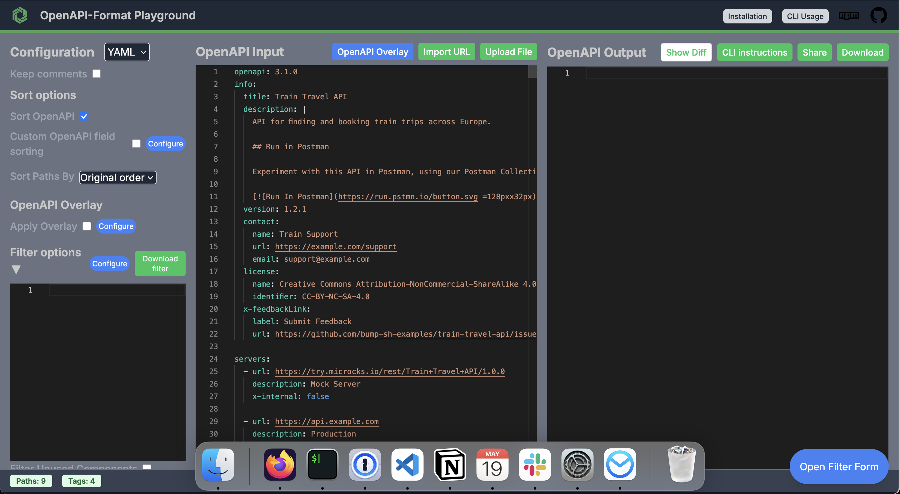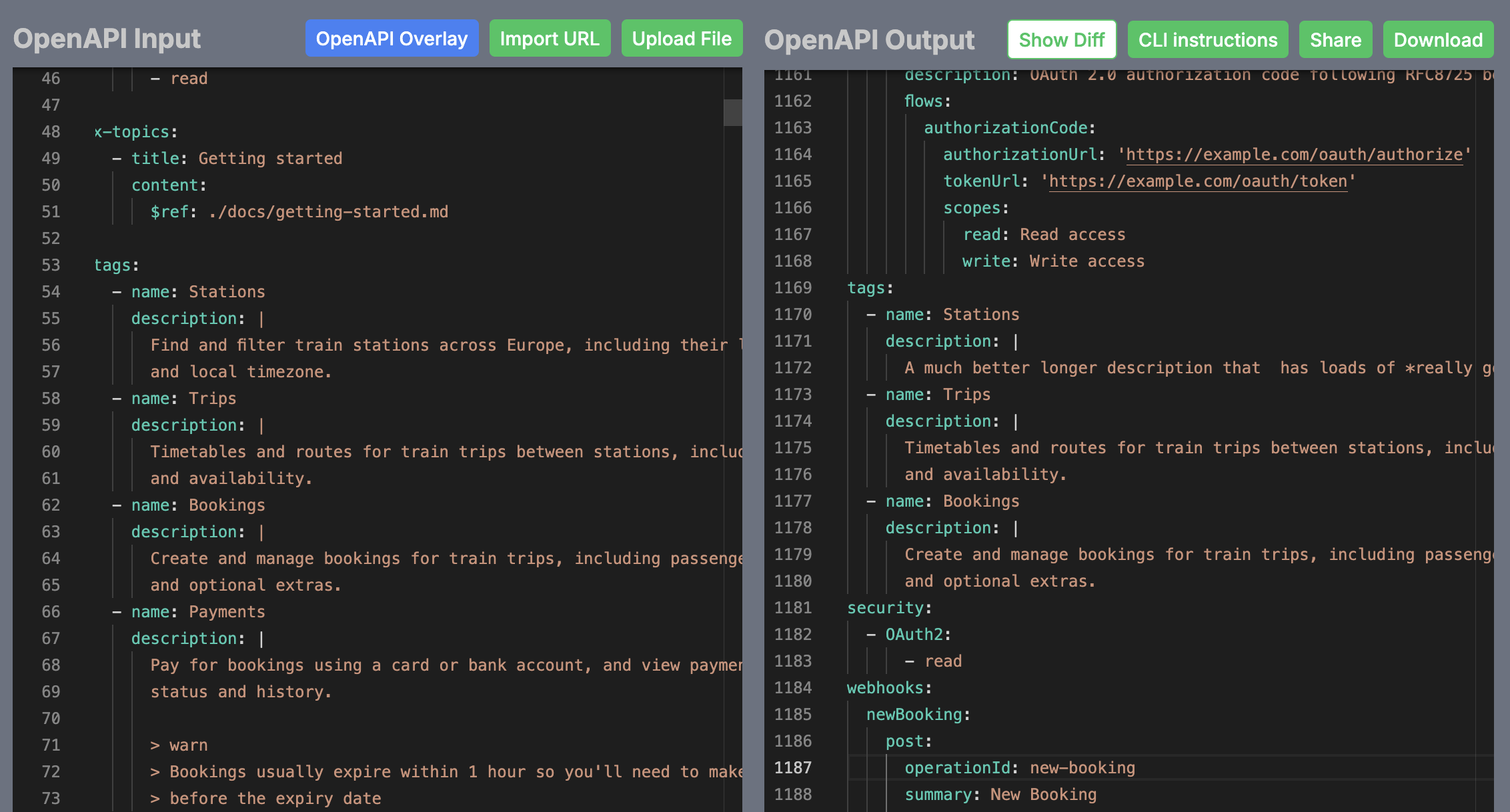 The main screen has OpenAPI input on the left and OpenAPI output on the right. The version on the right will have had the overlay applied as well as any other formatting rules, so we should see two changes to the tags: object: