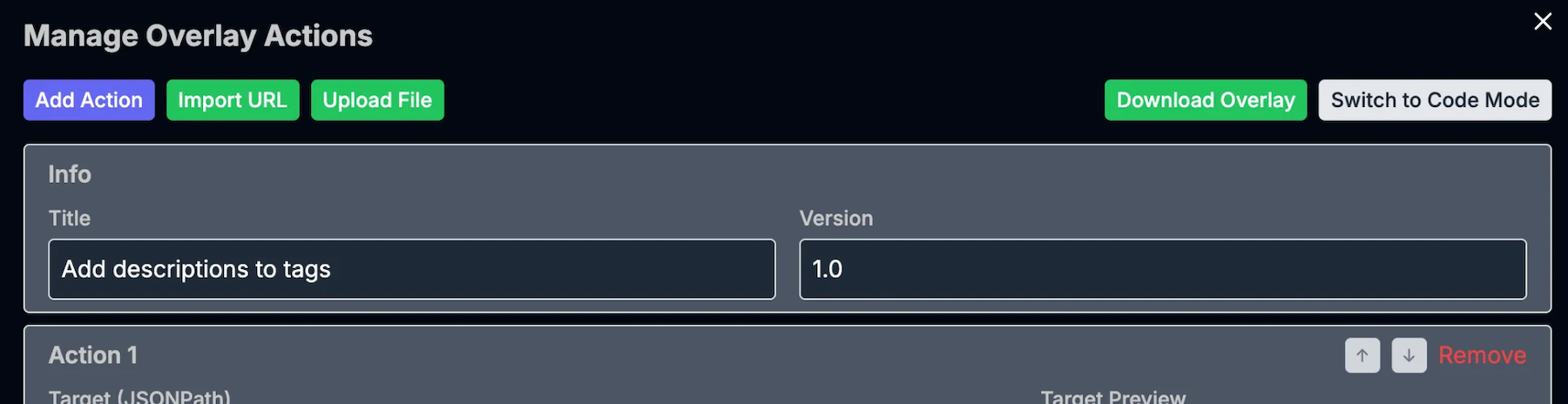 Overlays are essentially a series of “actions” which can be applied to a document, in order to create a new document with the resulting changes. Actions need a target defined as a JSONPath to point to a particular part of an OpenAPI document, and an action type of of “update” or “remove”. These actions can be used in combination to add new content, replace content, or filter out bits that aren’t wanted.