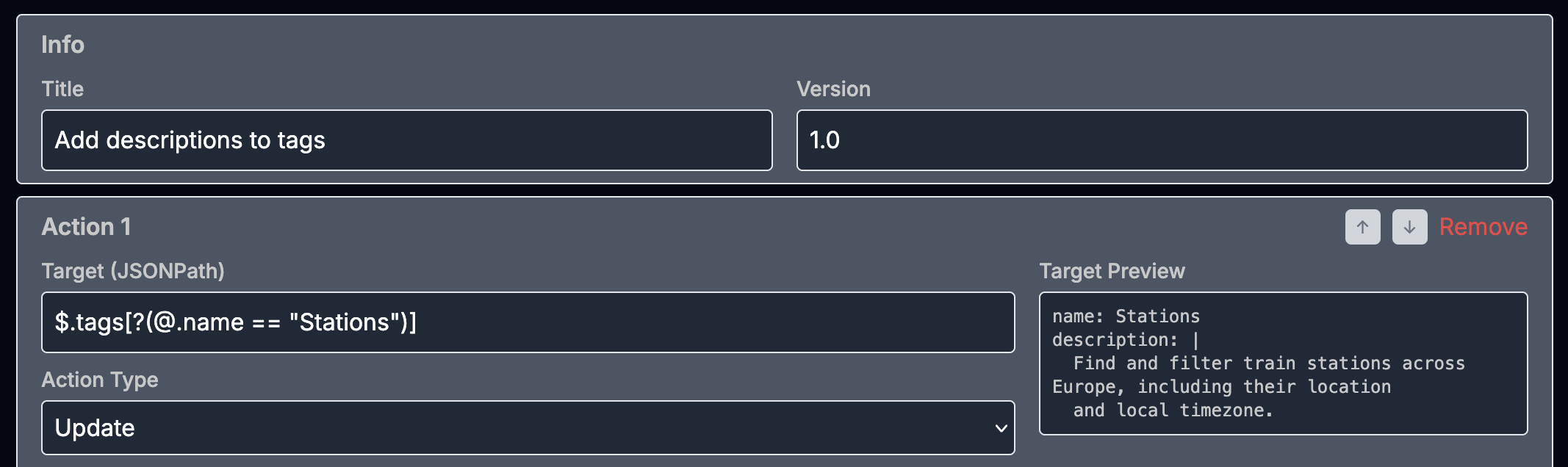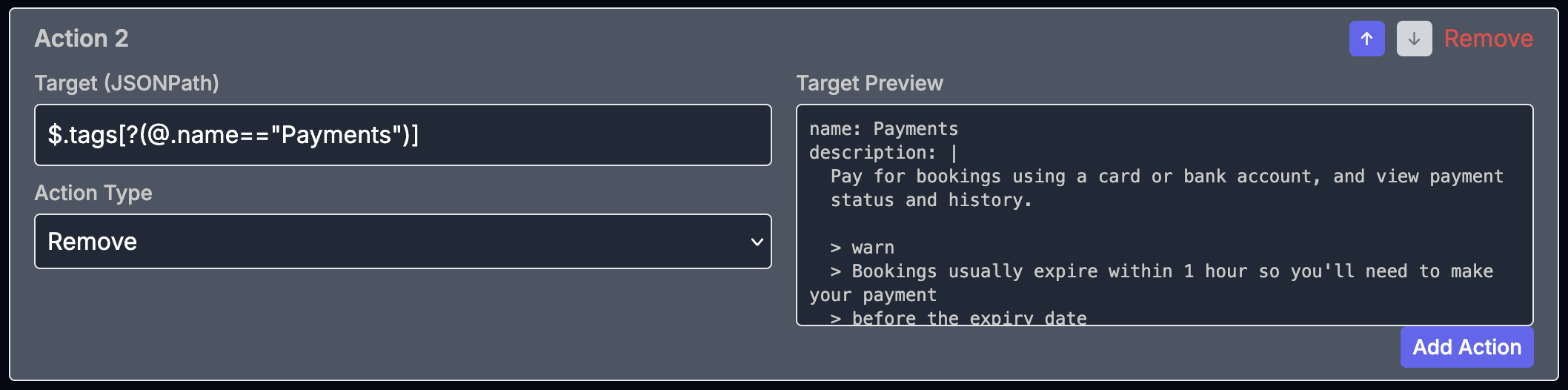 When you type in a JSONPath in the Target field, the Target Preview will update, so you can be certain you are working on the right bit of the OpenAPI document.