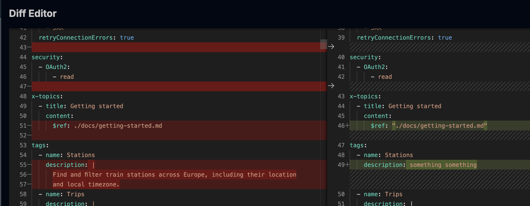 If its hard to see what has changed and you really want to be sure, you can click the Show Diff button to see the difference between the original OpenAPI document on the left, and the one with overlay changes on the right. Keep in mind that this will also show formatting changes, so there might be more changes than just the ones you made with the overlay.