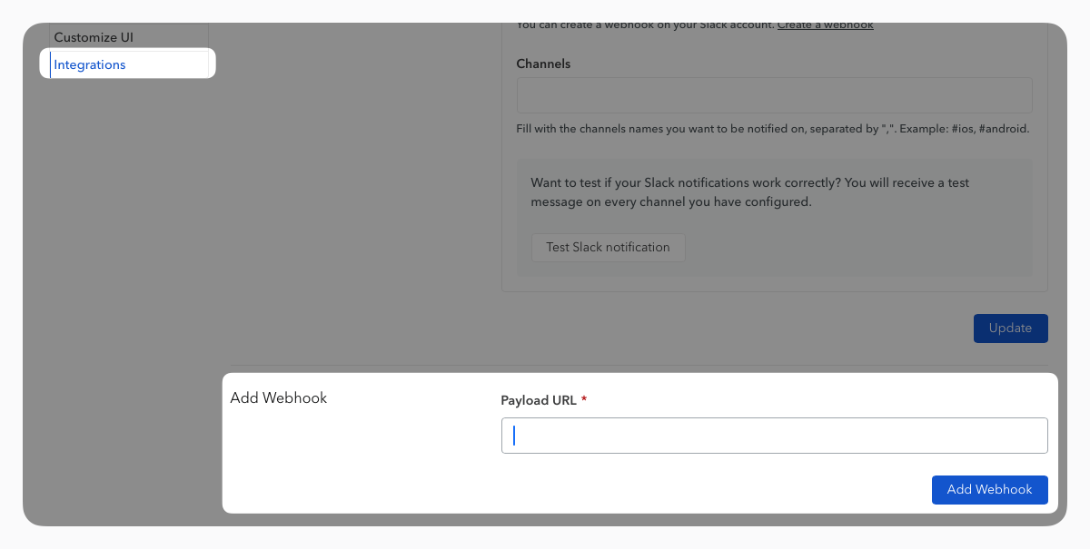 - Once you have copied the webhook URL, go to the settings of your documentation, in the Integrations tab, enable the Slack option, and provide the previously obtained webhook URL.