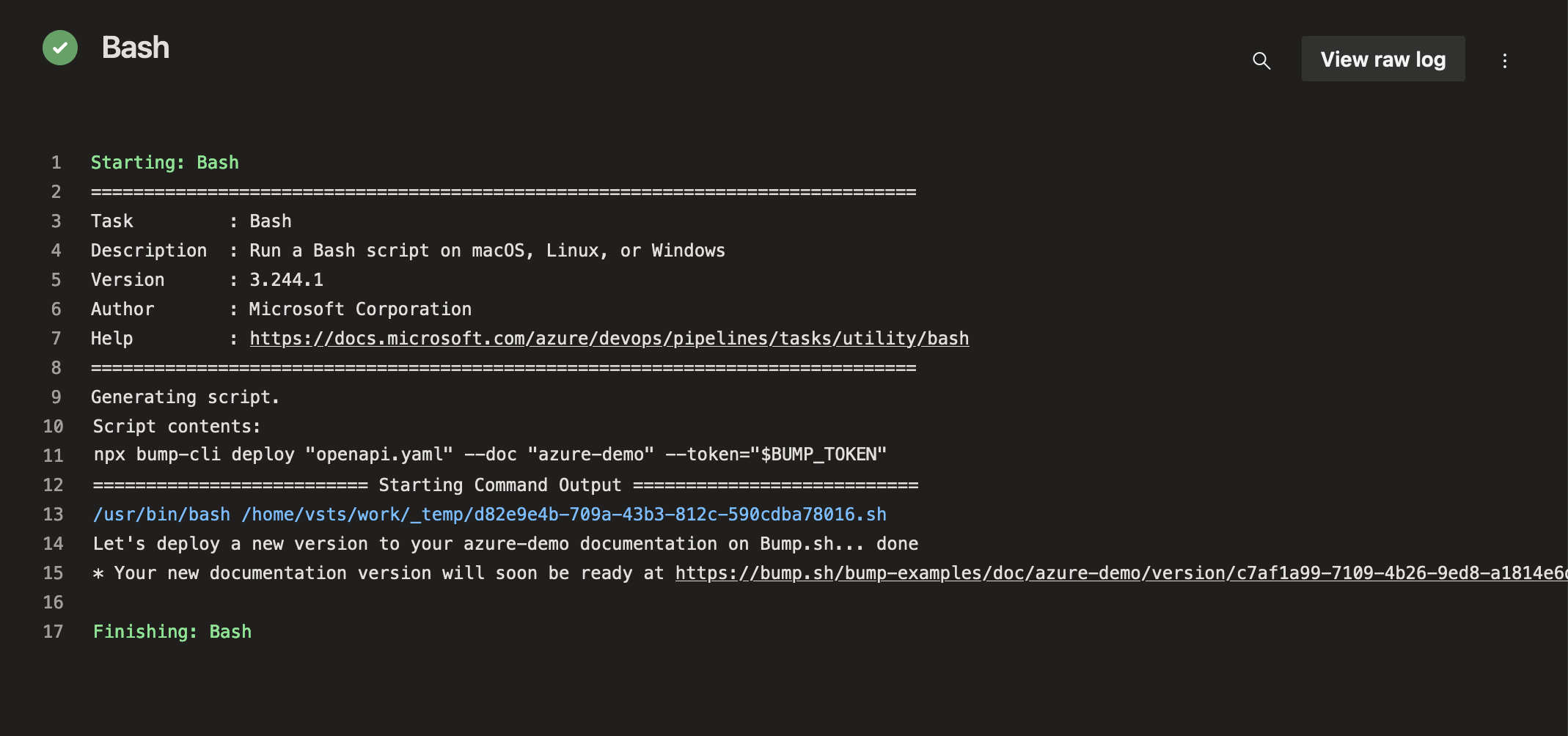 When pushing to the main you will trigger the deploy job, which will update your hosted Bump.sh documentation if any changes are detected, which will look like this: