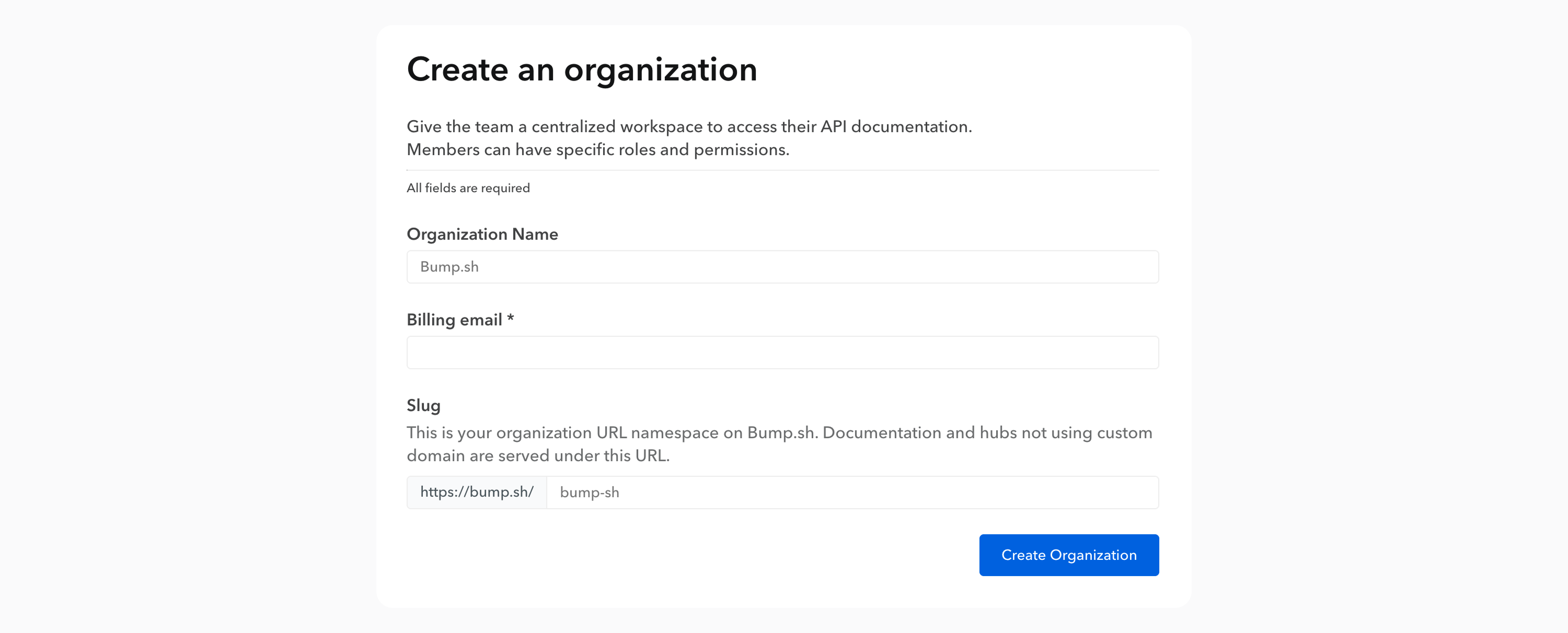 Now that your Bump.sh account is created, you will immediately be prompted to create your first organization. An organization allows you to work alone or collaboratively on your API documentation and hubs (a collection of documentation) within the same workspace.