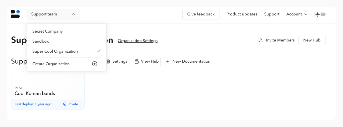 Organizations are at the heart of your Bump.sh experience. They allow you to access your entire API ecosystem and manage settings with ease. While perfectly functional for individual projects, organizations are designed to enable your teammates and guests to share this ecosystem together, within the same workspace with specific roles and rules.